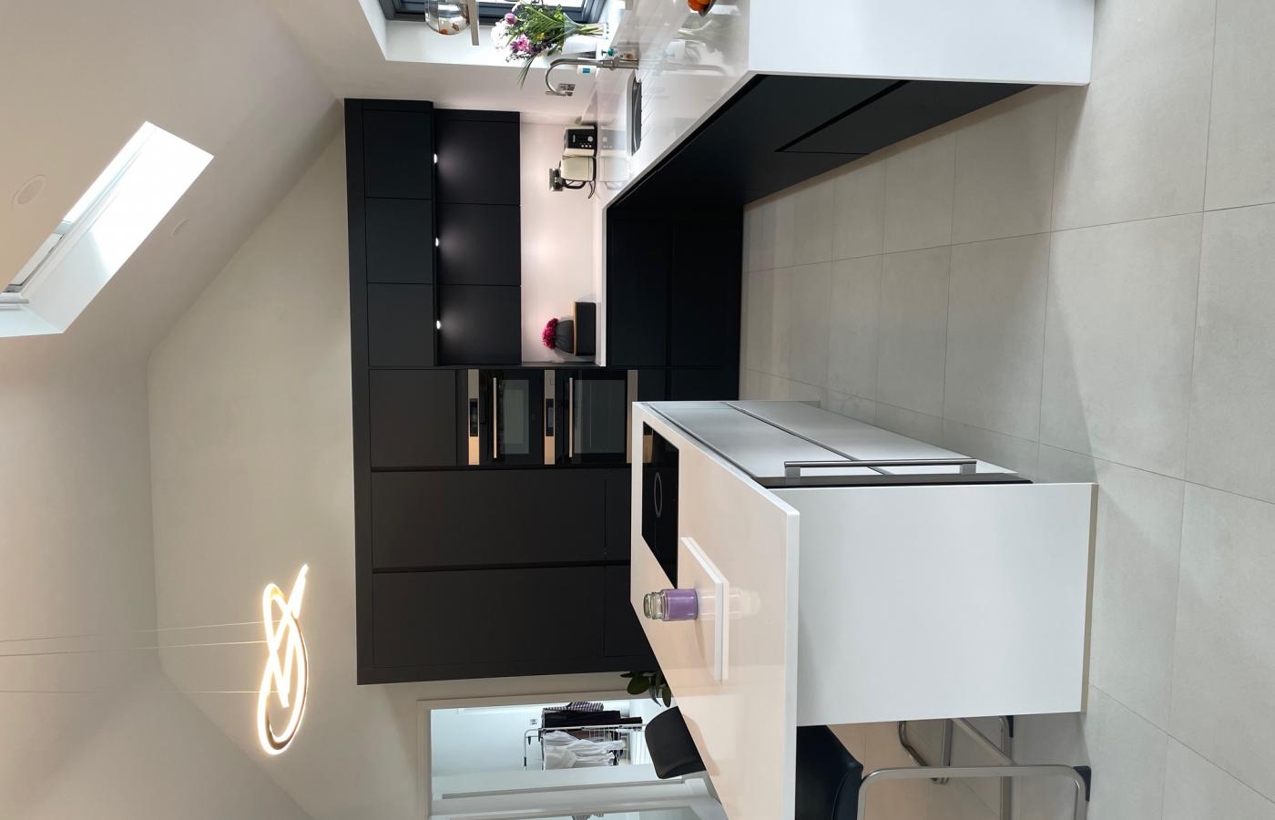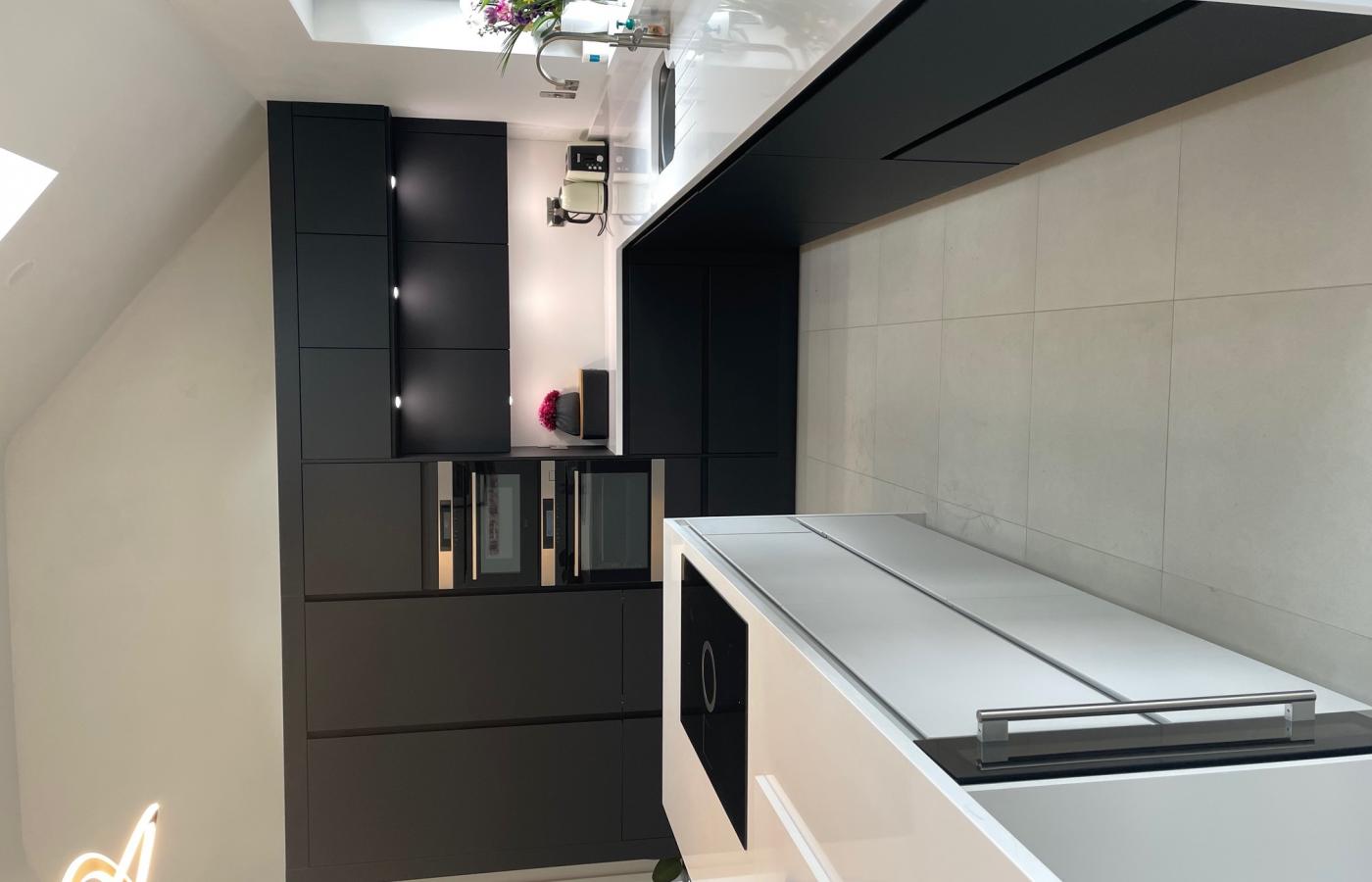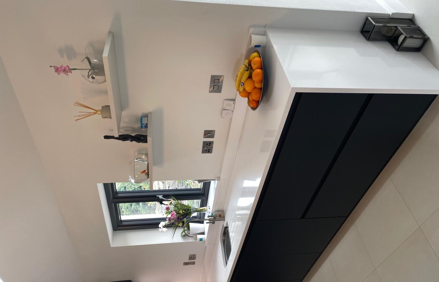 A Beautiful Matt Black Kitchen Done in the Y Line range using a Black inset Handle on the back of the door panels,