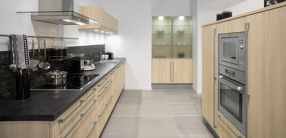 Well-designed galley kitchens can offer you an enjoyable user experience, if the ergonomics are well considered in the selected layout. As there are no corner units, and a reduced worktop space, storage and preparation area will be at a premium- but these issues are almost always surmountable with clever design. For instance Contemporary Kitchens can install a tap that retracts in to the work surface that, when used in conjunction with a purpose supplied sink cover, can increase the preparation area by a full cupboard width. We can also supply a small step stool that fits under the plinth, allowing easy access to tall units where occasional use items can be stored. Attention to detail makes the difference here.