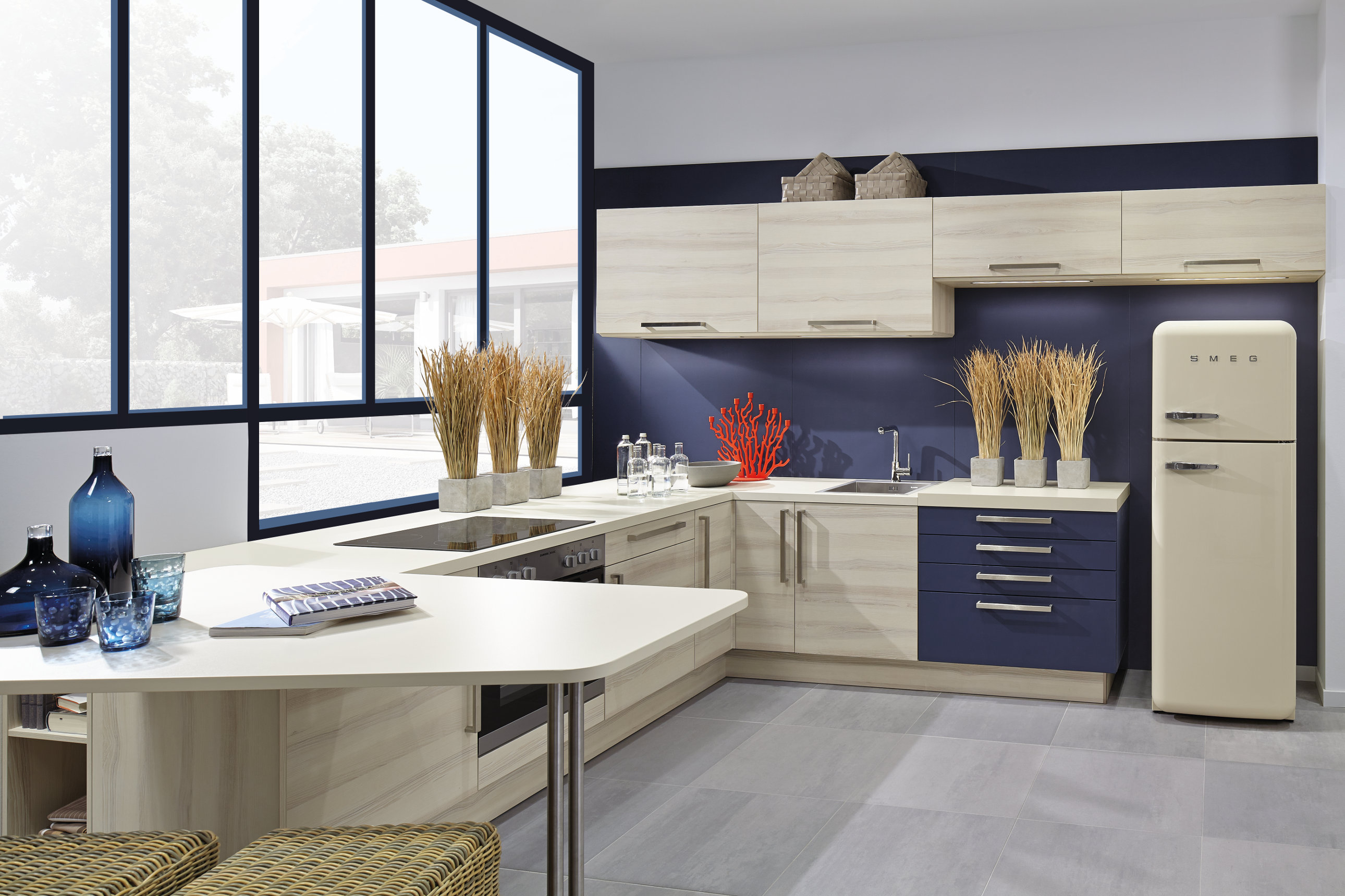 Increasingly popular in L-shaped kitchen design is the use of two-tone colour palettes, or the use of different materials. Our 3-D photo-realistic visualizations allow you to see various arrangements of these combined colour schemes and understand the visual impact these can have.