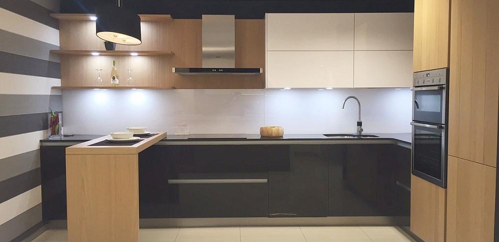 Matt Laquered Black Kitchen , Note the 100mm Margin along the top of the wall units and down the left hand side of th