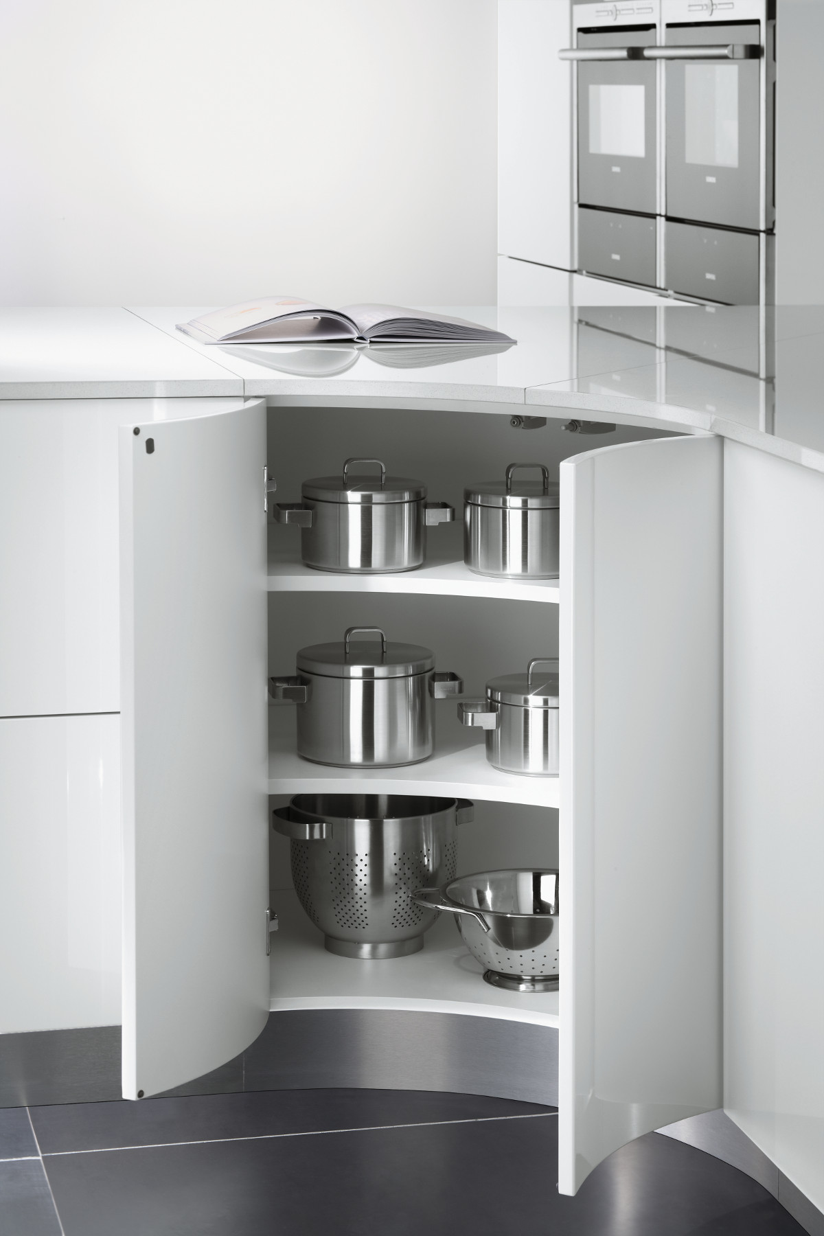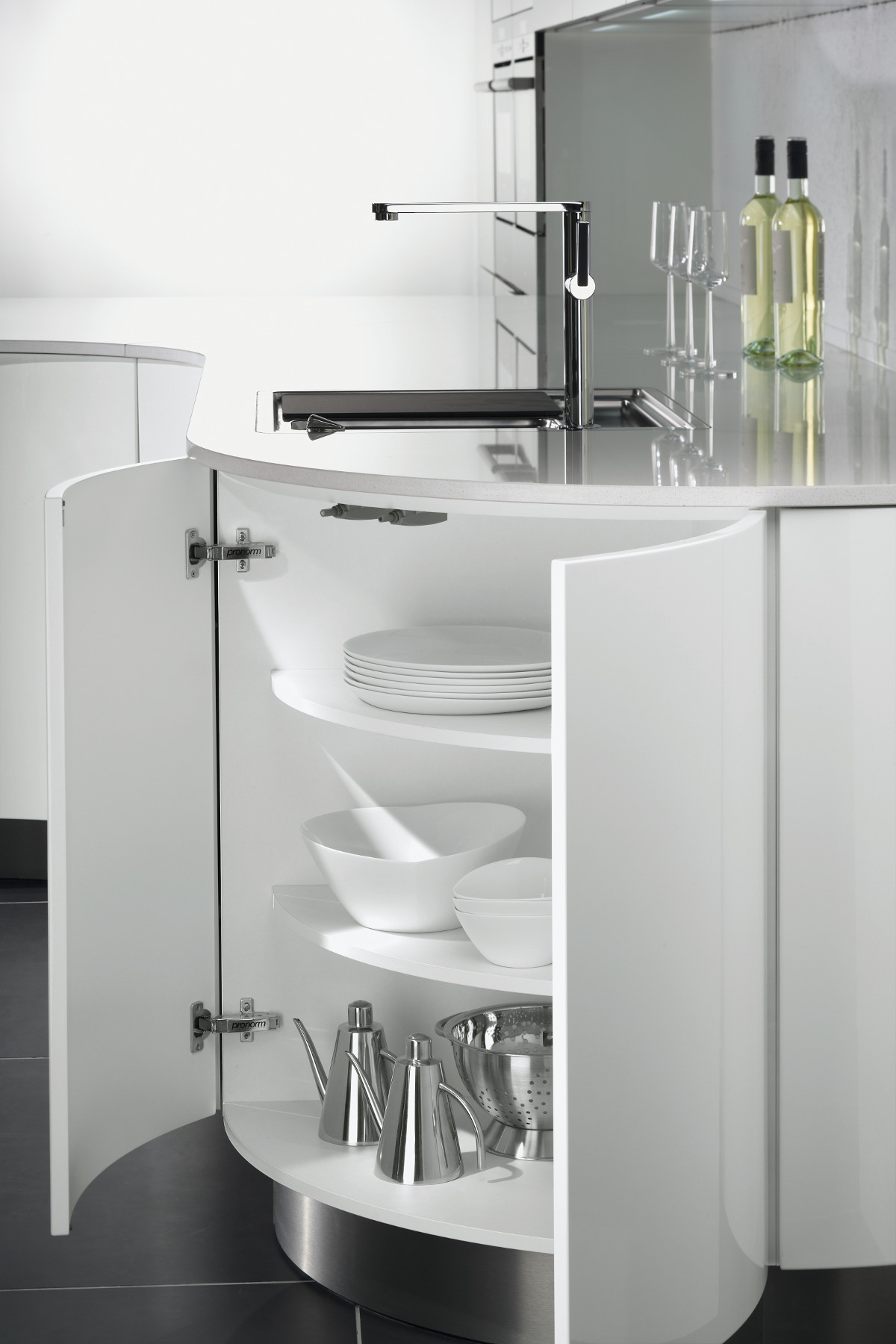 Just as important as the breadth of white kitchen finishes we have to offer is our ability to carefully manage the aesthetics of these kitchens. We know which shades of worktop and splash back will help you achieve the 'look' you desire. We have designed this style of kitchen for small compact spaces where there is no natural light, and also for large, glass fronted open plan rooms- and just about every setting in-between! We have used dramatic colours on worktops and glass splash backs and we also to create harmonious flowing designs by keeping all elements the same colour. We can also offer white kitchen designs featuring both convex and concave curved units.