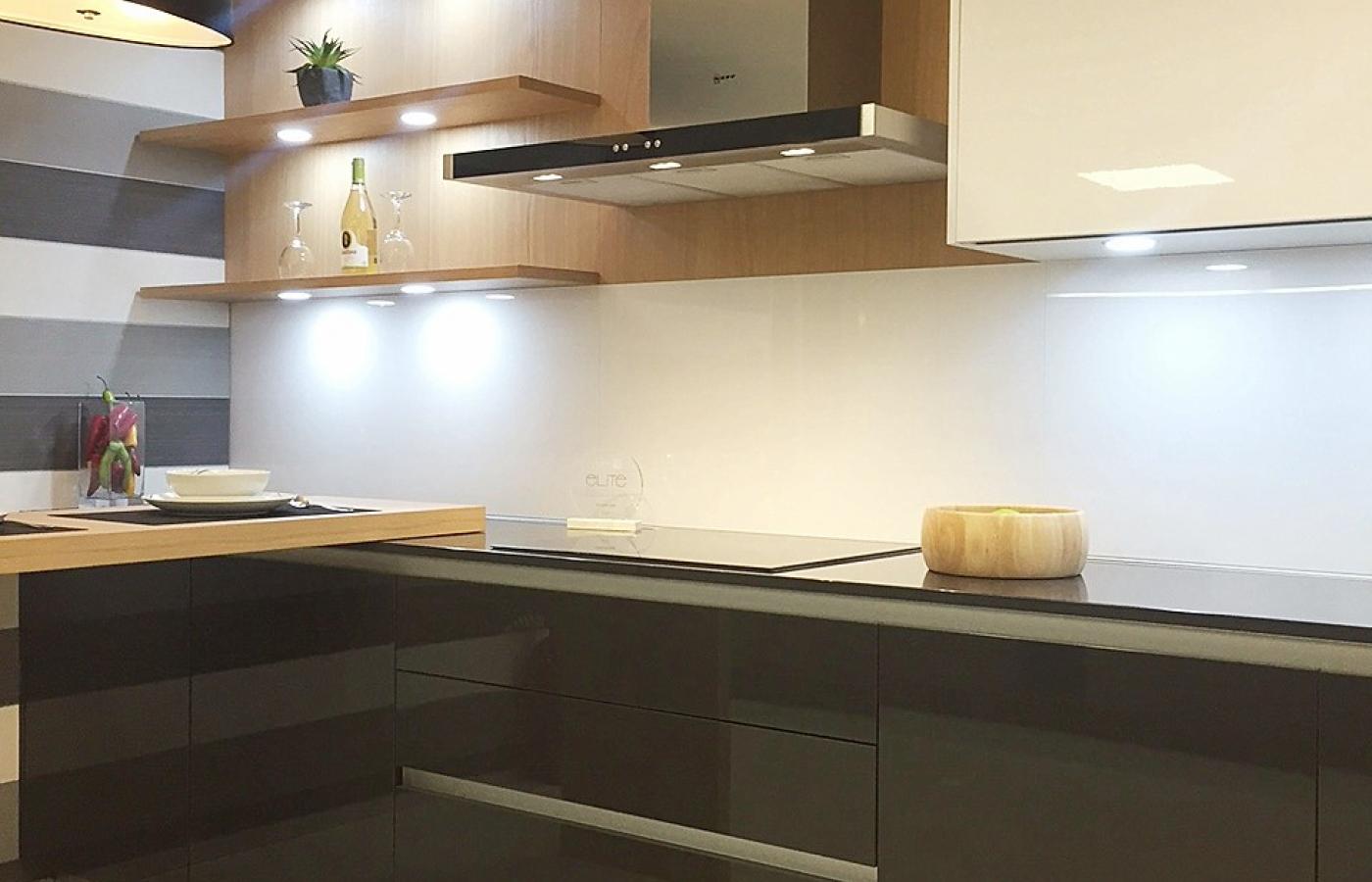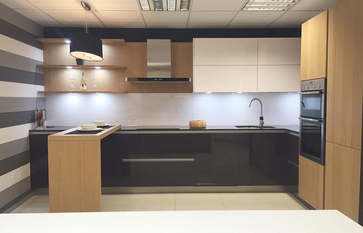 Showroom Display, A Mix of numerous colours in the one dosplay , Base units using X - Line range units colour Stratus grey high gloss , Wall units are Super White High gloss circular Led lights built in to base of the units, Tall units are Oak veneer and the Floating shelfs also. The splash back is super white highgloss. Note the inside of the drawers are titanium Range finish with oak inside lining ,Black inset matts are in the base of the drawers.